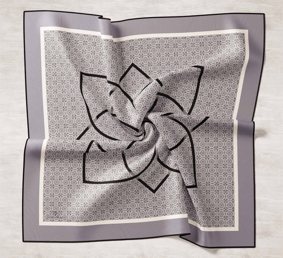 A light scarf with moorish motifs on the frame that move rhythmically when worn around the neck. This SilkHome Fatima silk scarf is a chic and edgy collection that will bring out the charm and lady-boss vibe in you!