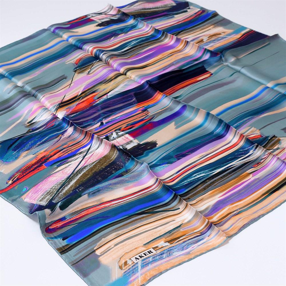 This gorgeous silk scarf Esti No. 51 is an absolute must-have this season. Inspired by waves in colorful abstract art,this scarf makes a powerful statement with a hint of modern chic in an ensemble. Wear this beautiful silk scarf as a dress scarf, head wrap, hair cover or as an exotic turban.