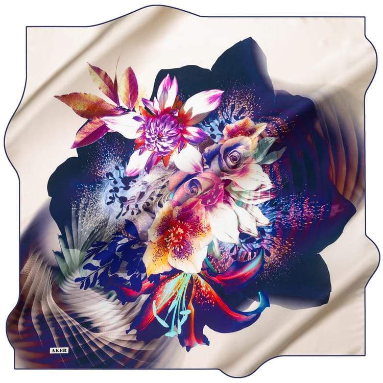 Look elegant and sophisticated with this gorgeous silk scarf that feature a vibrant flower arrangement. Suitable for today's modern women, this pure silk scarf will grace your wardrobe, making it a timeless fashion accessory. Made by Aker, renowned for its design and quality.