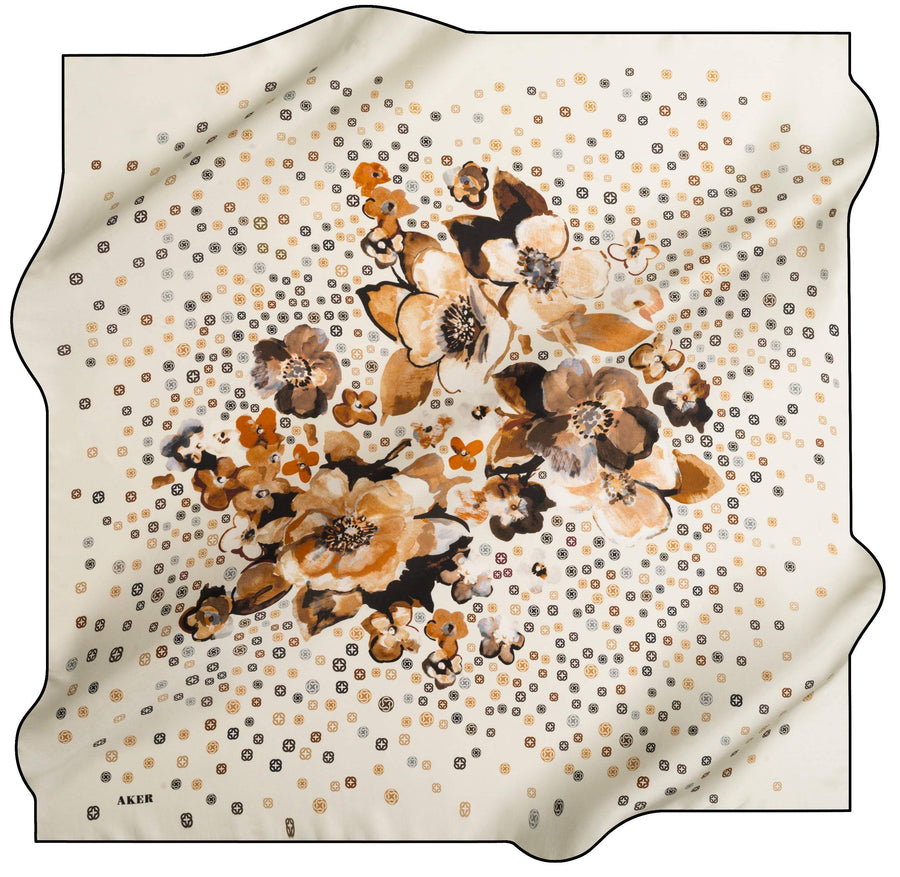 This new and beautiful silk scarf from Aker is inspired by watercolor floral painting in a neutral tone. Pair this beautiful scarf with any neutral tone outfit for sheer elegance and sophistication.