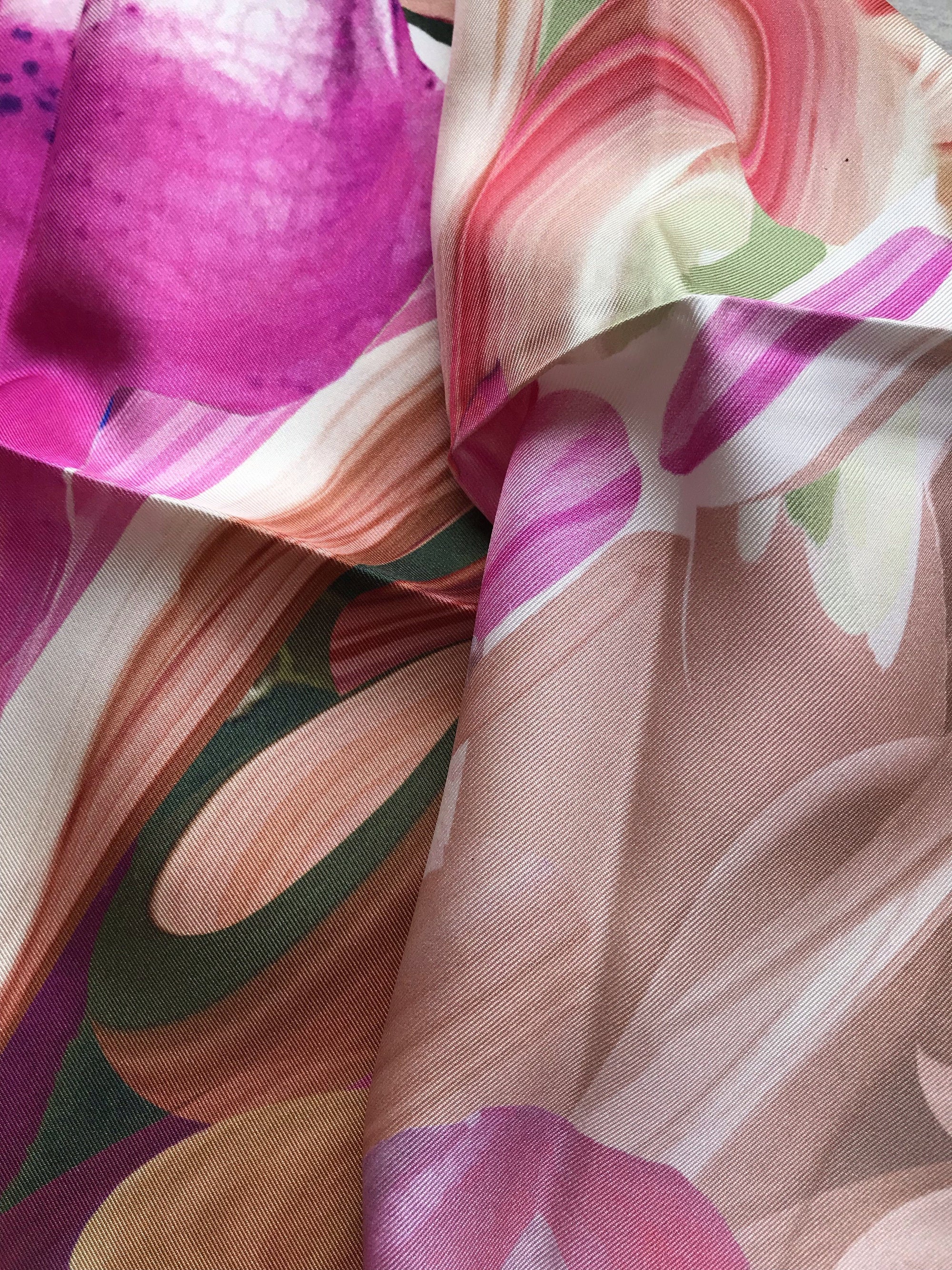 Our silk scarves are 100% pure silk. Twill weave gives shape, structure and grip