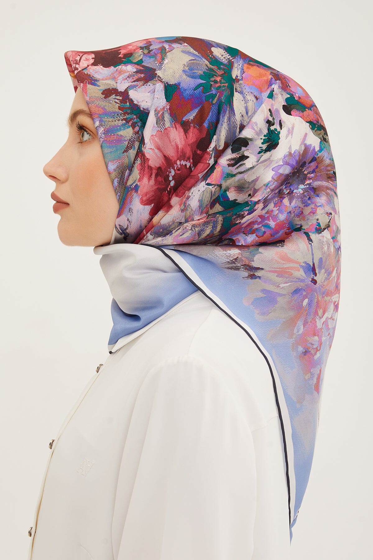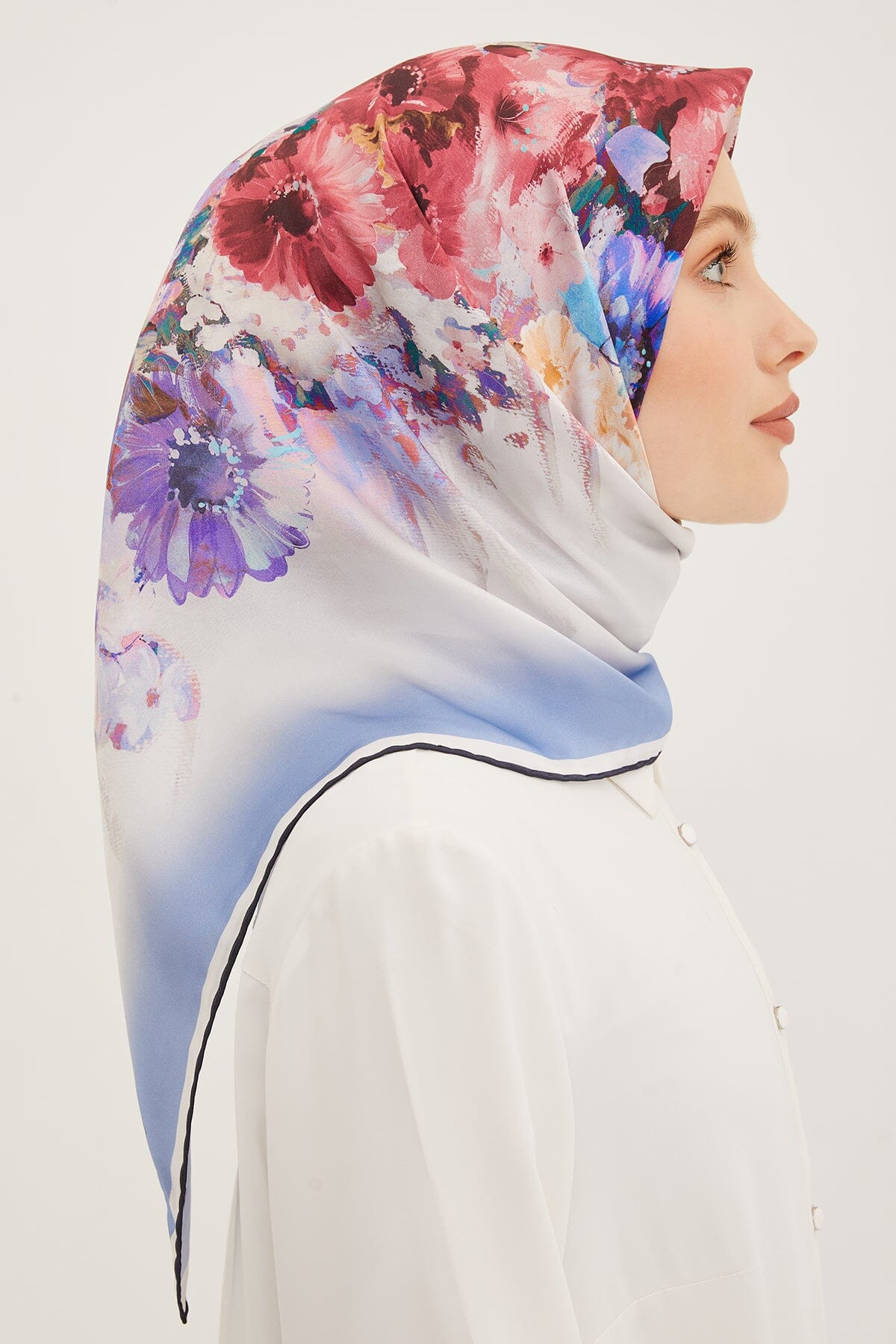 Dreamy blooms in pastel shades bring a sense of freshness to classic silk scarves. The Armine Estella Floral Silk Scarf features a unique celebration of beauty and art. The scarf is crafted from lightweight silky twill that flows effortlessly no matter how you style it. Style it in a minimal way to embrace the floral motifs that are scattered throughout the hijab.