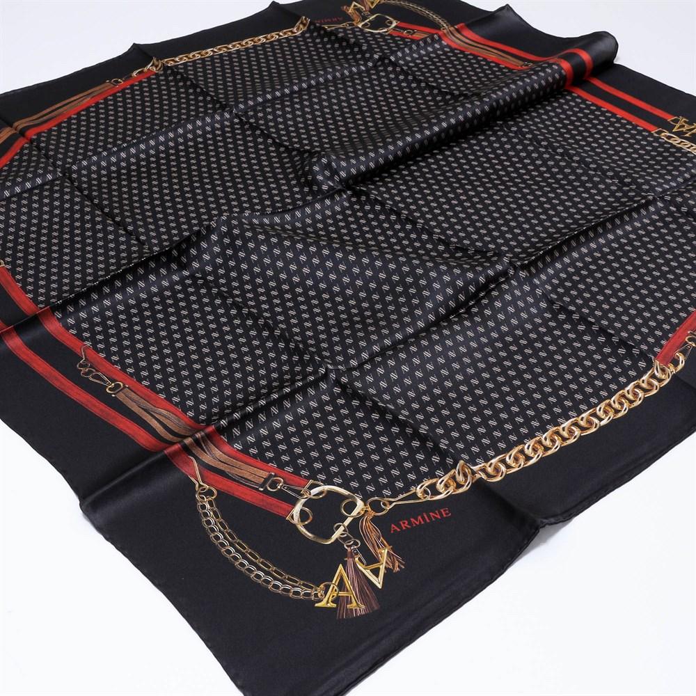 Add the final touch to your look with a Armine Monogram square silk scarf. This silk scarf adds a contemporary and classic element. This cutting-edge piece is adorned with iconic Armine initials and gold chain, creating a revamped Monogram pattern.