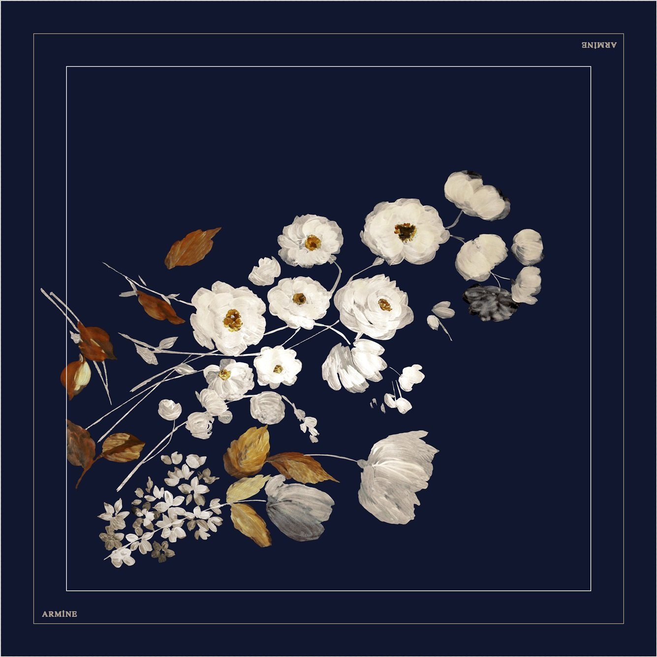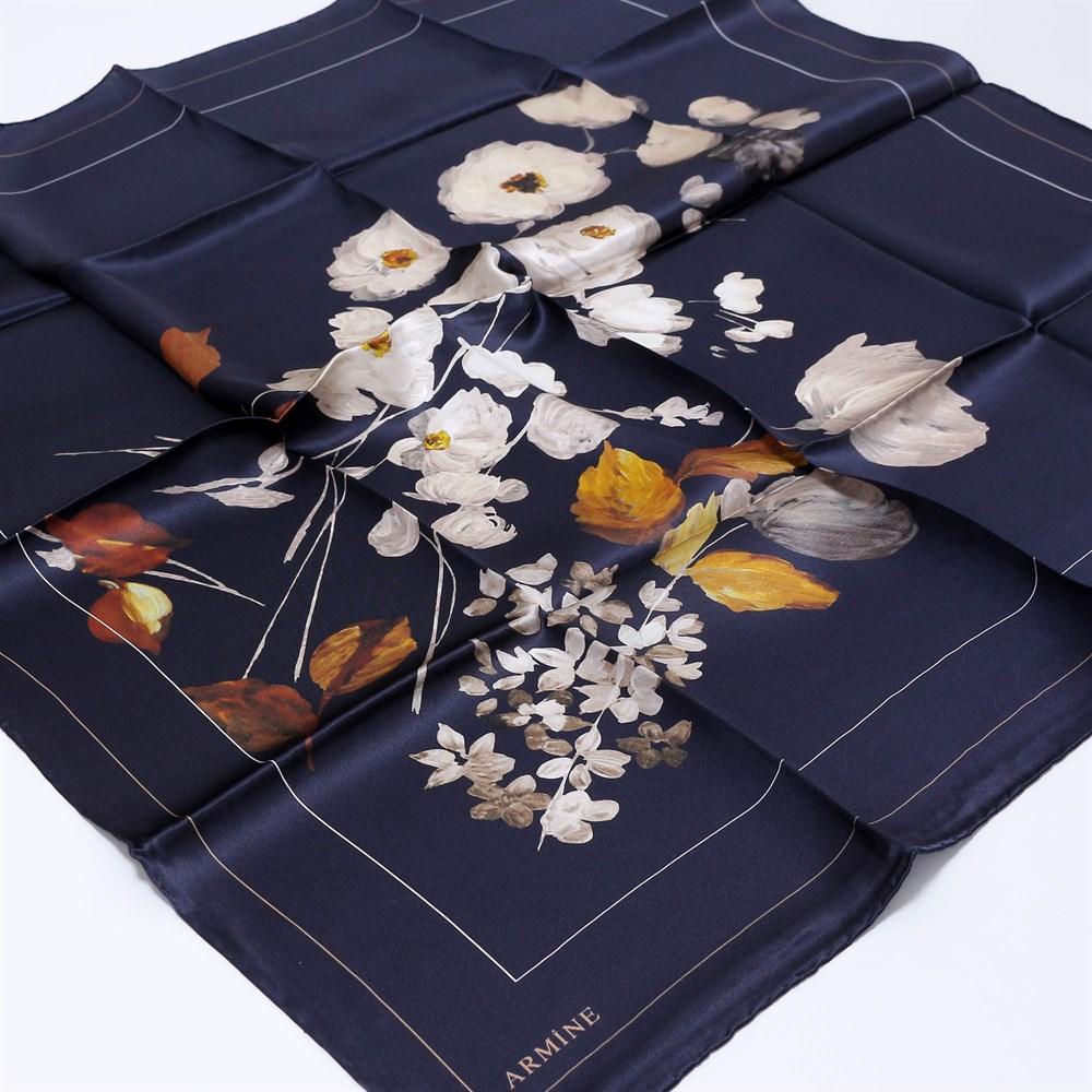 This elegant silk hair scarf Camilla is a classical and whimsical design that evokes a sense of purity and innocence. The distinct white Camilla flowers against the navy blue background makes this scarf sophisticated and flattering. Made with fine silk with twill weave, this scarf lends itself to endless styling possibilities!