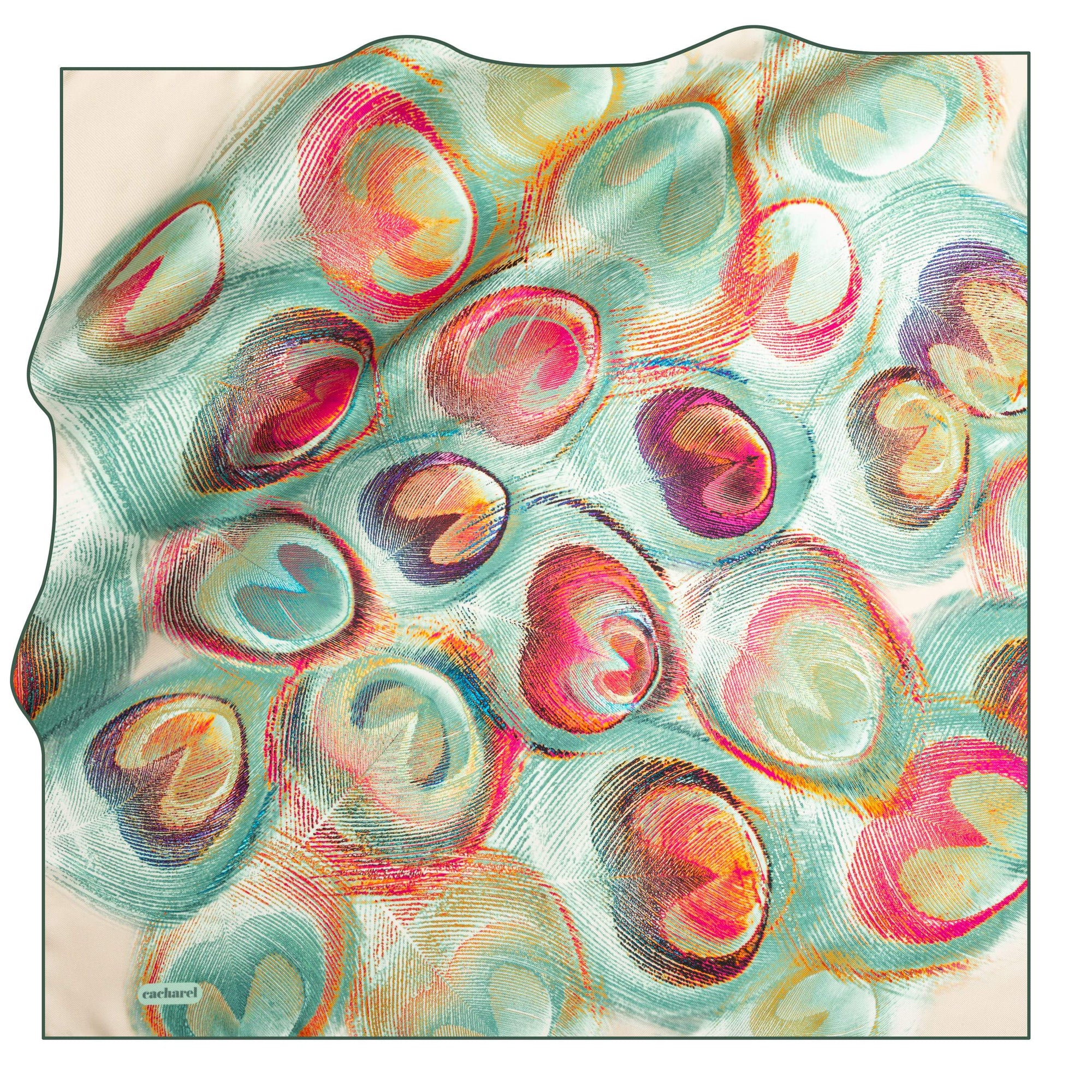 Elevate your scarf collection with this fresh and audacious designer print from designer house - Cacharel. This lightweight square scarf features a stylish peacock-feather print with a valentine's day twist. Perfect to create a fun and exuberant look.