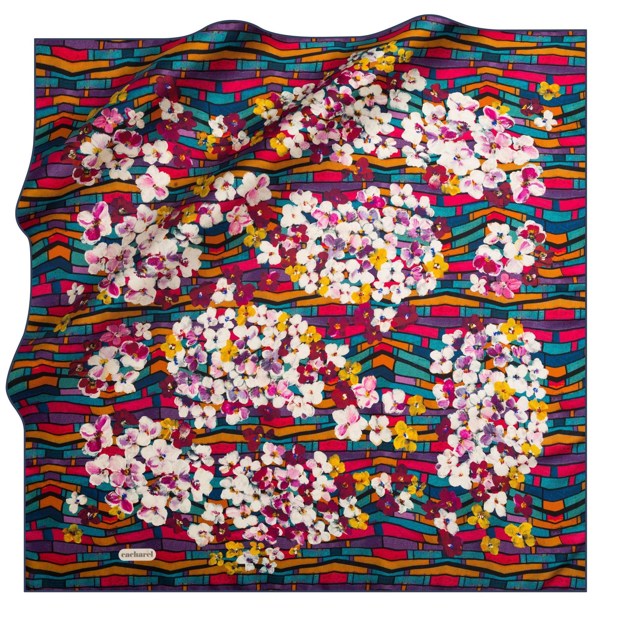 Inspired by cluster of dainty flowers, geometrical shapes and vibrant colors, this stunning square scarf is great to amp up your look. Give your outfit the colour pop you desired. Wear this silk scarf as a glamorous turban, or a eye-catching head scarf.